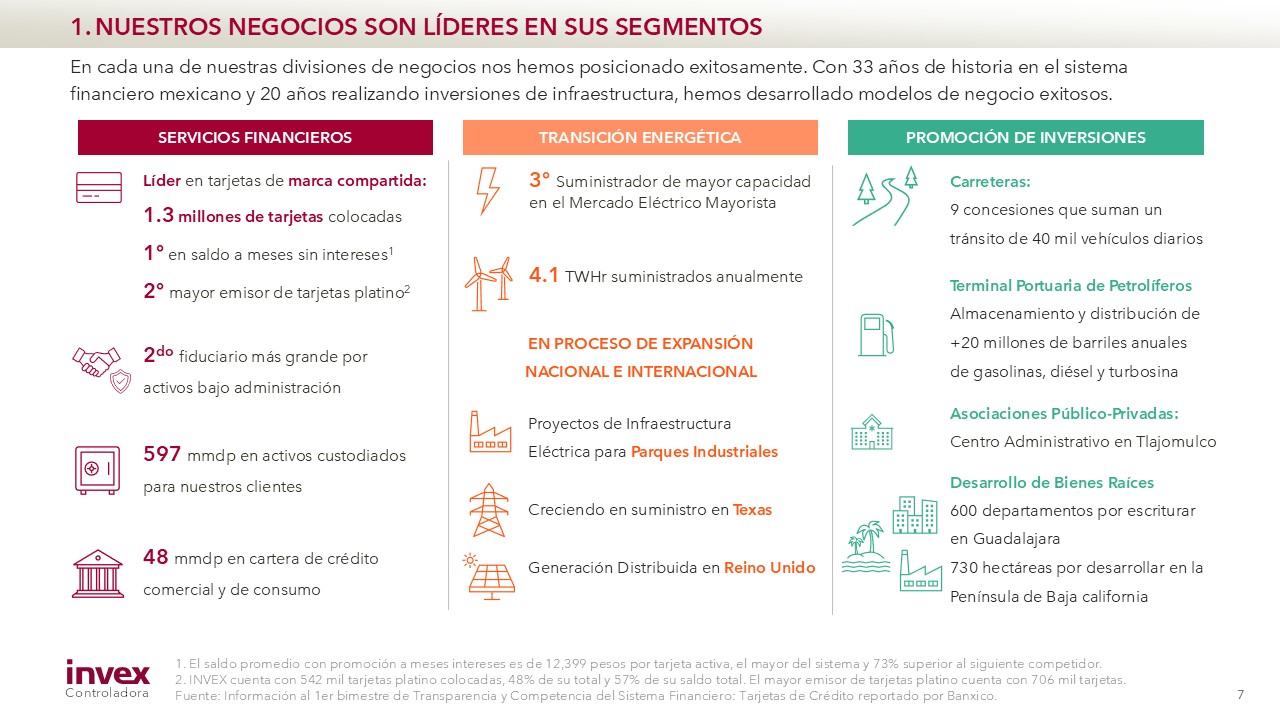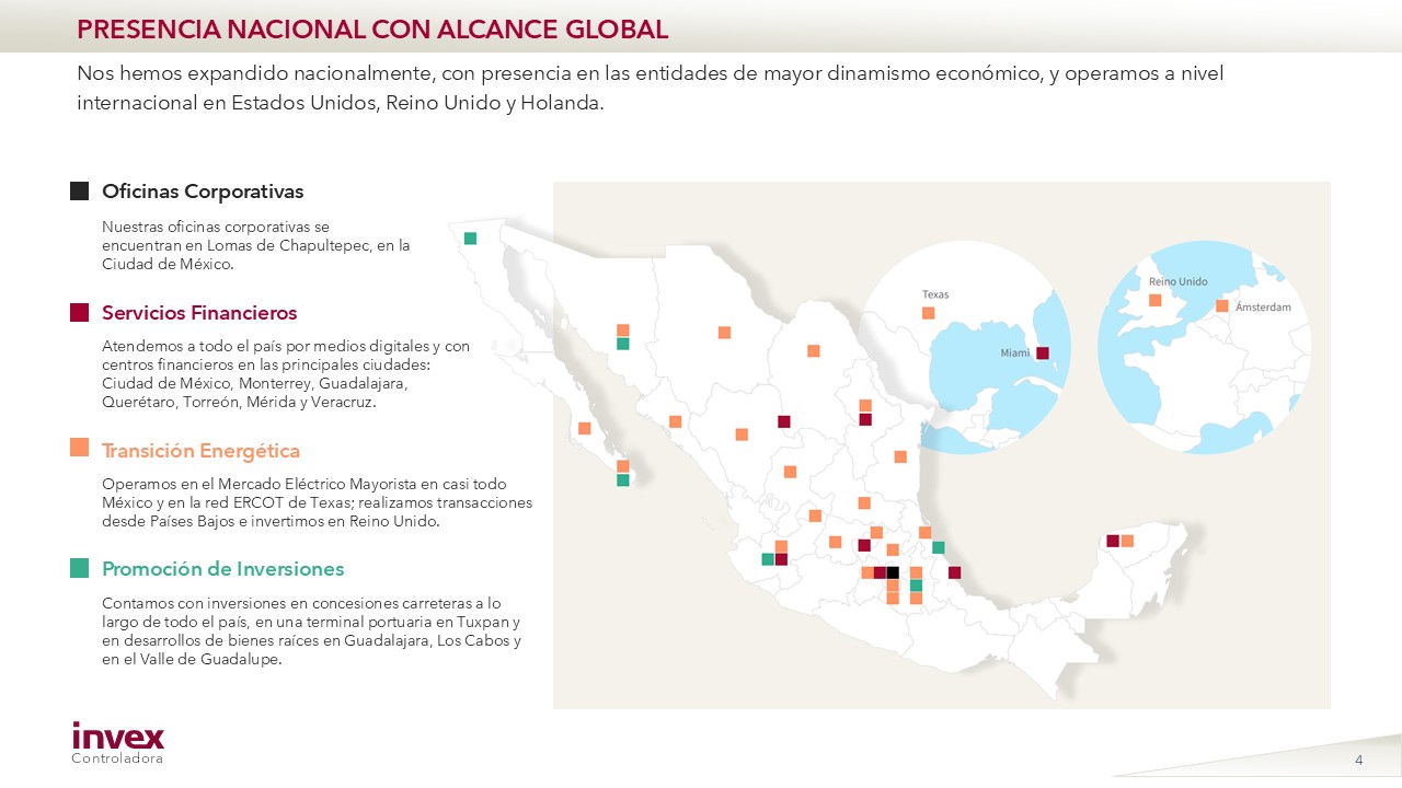 Los servicios financieros incluyen arrendamiento puro a través de INVEX Arrendadora e intermediación internacional en el mercado de valores a través de INVEX Holdigns.